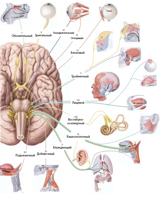 Функция: эти три нерва работают вместе — они управляют мышцами, которые двигают глазное яблоко. Глазодвигательный нерв контролирует большинство глазных мышц и зрачок с веком, блоковый нерв управляет верхней косой мышцей, отводящий нерв — наружной прямой мышцей. Все три — моторные нервы.