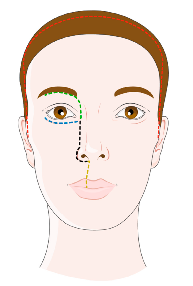 Эти разрезы могут быть продлены на другие области лица в зависимости от распространенности опухоли.