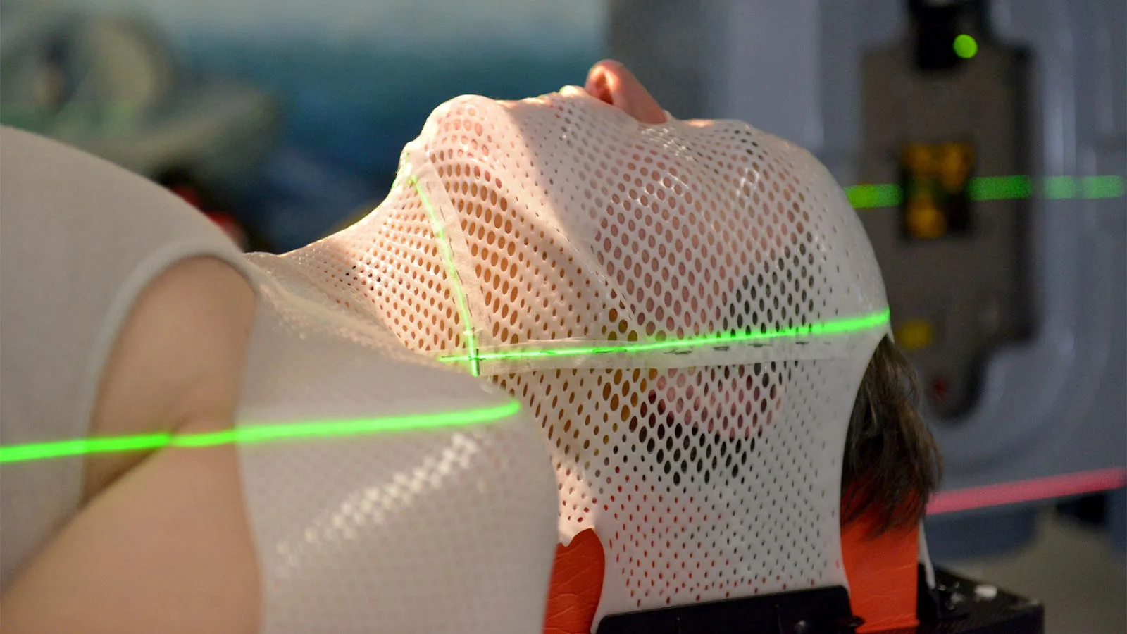 Такая термопластическая маска исключает движения головой во время сеанса облучения и гарантирует точное совпадение положения головы пациента с положением на КТ-топометрии. Внешний вид и конфигурация маски может несколько различаться.